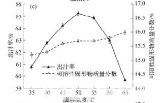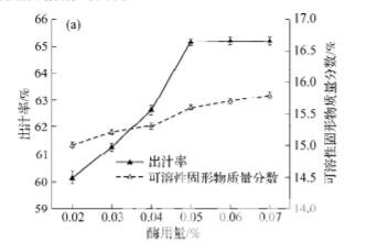酶用量的確定: 在果汁自然 pH 3.65±0.01, 酶 解溫度為 50 ℃, 酶解時間 90 min, 復合酶比例(果 膠酶:纖維素酶)為 3:1 條件下, 分別選取復合酶添 加量0.03%, 0.04%, 0.05%, 0.06%和0.07%進行單因 素試驗, 分別測定胡柚出汁率和可溶性固形物含 量, 確定最佳復合酶添加量. 復合酶比例的確定: 在果汁自然 pH, 酶解溫 度為 50 ℃, 酶解時間 90 min, 酶添加量 0.05%條件 下, 分別選取復合酶比例 2:3, 1:1, 3:2, 2:1, 3:1 和 4:1 進行單因素試驗, 分別測定胡柚出汁率和可溶 性固形物含量, 確定最佳復合酶比例. 酶解溫度的確定: 在果汁自然 pH, 酶解時間 90 min, 酶添加量 0.05%, 復合酶比例為 3:1 條件下, 根據(jù)酶的催化動力學特性及果膠酶和纖維素酶的 溫度作用范圍, 分別選取酶解溫度 35, 40, 45, 50, 55, 60 和 65 ℃進行單因素試驗, 分別測定胡柚 出汁率和可溶性固形物含量, 確定最佳酶解溫度. 酶解時間的確定: 在果汁自然 pH, 酶解溫度 為 50 ℃, 酶添加量 0.05%, 復合酶比例為 3:1 條件 下, 分別選取酶解時間為 30, 60, 90, 120 和 150 min 進行單因素試驗, 分別測定胡柚出汁率和可溶性 固形物含量, 確定最佳酶解時間。