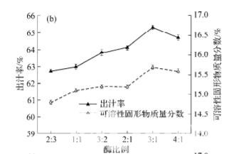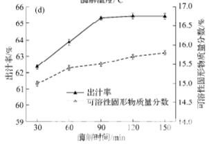 復合酶用量、酶比例、酶解溫度、酶解時間對 胡柚出汁率及可溶性固形物含量的影響結(jié)果如下圖所示. 由下圖可知, 當果膠酶和纖維素酶用量在 0.02%~0.05%時, 胡柚出汁率和可溶性固形物含量 隨酶添加量的增加而增加, 酶解未進行完全. 當 2 種酶用量大于 0.05%時, 酶用量增加, 出汁率不再 增加, 趨于穩(wěn)定, 可溶性固形物含量也增長緩慢, 酶解進行徹底. 結(jié)合生產(chǎn)成本考慮, 選擇酶用量為 0.05%. 當果膠酶與纖維素酶的比例為3:1時, 胡柚 出汁率最高, 達到 65.31%, 可溶性固形物含量也 達最高, 故選擇酶比例為3:1. 隨酶解溫度升高, 胡 柚出汁率呈現(xiàn)先上升后下降趨勢. 酶解溫度為 50 ℃時, 胡柚果肉出汁率最高為 65.29%. 超過最 適溫度后, 果膠酶和纖維素酶的催化活性降低, 胡 柚汁水分蒸發(fā)也較快, 導致胡柚出汁率急劇下降, 可溶性固形物含量升高, 故選擇酶解溫度為 50 ℃. 當酶解時間小于 90 min 時, 隨酶解時間增加, 胡柚 出汁率增幅顯著. 90 min 時, 出汁率為 65.34%. 隨 著酶解時間的繼續(xù)增加, 胡柚出汁率略有升高, 但 增幅不大, 可溶性固形物含量隨酶解時間延長緩 慢增加, 考慮長時間酶解會加深果汁褐變程度, 故選擇酶解時間為 90 min。