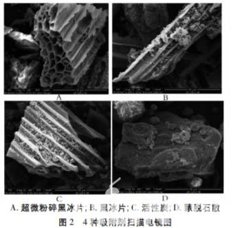 經(jīng)掃描電鏡觀察黑 冰片的結(jié)構(gòu)與活性炭相似,呈規(guī)則的網(wǎng)孔狀,蒙脫石 散呈不規(guī)則的塊狀結(jié)構(gòu),見(jiàn)圖 2。
