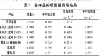 各樣品吸附值結(jié)果見(jiàn)表 2。 結(jié)果顯示,黑冰片對(duì)亞甲基藍(lán)有一定的吸附作用,不 同生產(chǎn)批次的同等質(zhì)量的黑冰片吸附能力差異不 大,說(shuō)明生產(chǎn)廠家生產(chǎn)的黑冰片質(zhì)量穩(wěn)定。比較不 同粒徑黑冰片吸附能力可知,黑冰片顆粒粒徑越小, 吸附能力越強(qiáng)。比較相同質(zhì)量的各種吸附劑的吸附 能力,黑冰片的吸附能力最弱,蒙脫石吸附能力最 強(qiáng)。由此可以得出黑冰片作為炭類(lèi)藥物具有一定吸 附能力,但是其吸附能力與活性炭、蒙脫石這類(lèi)臨床 常見(jiàn)藥相比不是很強(qiáng)。