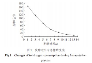 茶酒發(fā)酵過程中總糖的變化如圖 1。 從圖 1 可以知道,在發(fā)酵初期,由于酵母菌大量生長繁殖的需要,對(duì)糖的利用率很高,導(dǎo)致降糖速度非 常快。隨著發(fā)酵的進(jìn)行,降糖速度變慢,主要是由于酒 精含量和酸度的不斷增加,均會(huì)在一定程度上影響釀 酒酵母的代謝活動(dòng)能力,從而降低了糖的消耗速度。 直到總糖不再變化時(shí),發(fā)酵也幾乎停止,到主發(fā)酵結(jié) 束時(shí)總糖含量為 7.5 g/L。