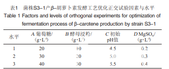 菌株活化:將菌株S3-1劃線于活化培養(yǎng)基,28 ℃倒置 培養(yǎng)3 d。種子培養(yǎng):挑取活化培養(yǎng)基上的單菌落接種于裝 液量為50 mL/250 mL的種子培養(yǎng)基中,28 ℃、150 r/min條 件下培養(yǎng)至對數(shù)期。發(fā)酵培養(yǎng):按6%(V/V)的接種量將種 子液接種于裝液量為40 mL/250 mL的基礎(chǔ)發(fā)酵培養(yǎng)基中, 28 ℃、150 r/min條件下培養(yǎng)84 h。參考楊文等的方法,采 用酸熱法進(jìn)行破壁,丙酮進(jìn)行提取,提取至菌體變白,合并 提取液,提取過程盡量避光。 在基礎(chǔ)發(fā)酵培養(yǎng)基的基礎(chǔ)上,分別考察碳源種類(葡 萄糖、果糖、蔗糖、木糖、乳糖、麥芽糖、可溶性淀粉、甘油) 及添加量(10 g/L、20 g/L、30 g/L、40 g/L、50 g/L、60 g/L)、氮 源種類(酵母浸粉、蛋白胨、玉米漿、酵母浸粉+蛋白胨)及 添加量(10 g/L、20 g/L、30 g/L、40 g/L、50 g/L、60 g/L)、硫酸 鎂添加量(0、0.3 g/L、0.6 g/L、0.9 g/L、1.2 g/L、1.5 g/L)、初始 pH值(5.0、5.5、6.0、6.5、7.0)對菌體生長和β-胡蘿卜素產(chǎn)量 的影響。根據(jù)β-胡蘿卜素的產(chǎn)量和純度篩選影響顯著的因 子和最佳水平,進(jìn)行4因素3水平正交試驗,正交試驗因素 與水平見表1。