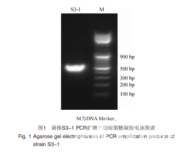 菌株S3-1的PCR擴(kuò)增產(chǎn)物的電泳圖譜見圖1。由圖1可 知,PCR擴(kuò)增產(chǎn)物堿基長度約為574 bp,與目的基因堿基長度相符,進(jìn)行測序。