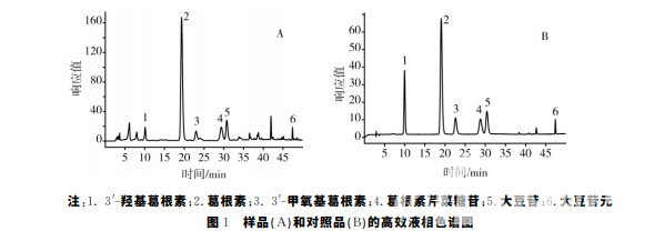 精密稱取葛根樣品粉末 0.1g,加30%乙醇25mL,靜置30min,稱量,加熱 回流30min,冷卻至室溫,再次稱質量,用30%乙醇 水溶液補足減失的量,取上清液,0.45μm 微孔濾膜 過濾,取續濾液,即得。