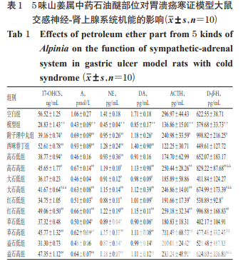 知母、高良姜、大高良姜、紅豆蔻、草豆蔻、益智飲片 (批號分別為 150601、160101、170912、160605、170801、 170718)均購自南寧生源中藥飲片有限責任公司,經廣 西中醫藥大學中藥鑒定學教研室田慧教授鑒定為真品。 附子理中丸(陽性對照,北京同仁堂科技發展股份 有限公司制藥廠,批號:15010241,規格:每 100 粒重 10 g);西咪替丁片(陽性對照,廣東華南藥業集團有限公 司 ,批 號 :150802,規 格 :0.2 g);17- 羥 皮 質 類 固 醇 (17-OHCS)、腎上腺素(A)、去甲腎上腺素(NE)、多巴胺 (DA)、促腎上腺皮質素(ACTH)、多巴胺-β-羥化酶 (D-β-H)試劑盒(上海酶聯生物科技有限公司,批號分別 為 RA20057、RA20337、RA20557、RA20050、RA20014、 RA20218);乙醇、乙酸乙酯等試劑均為分析純,水為蒸 餾水。