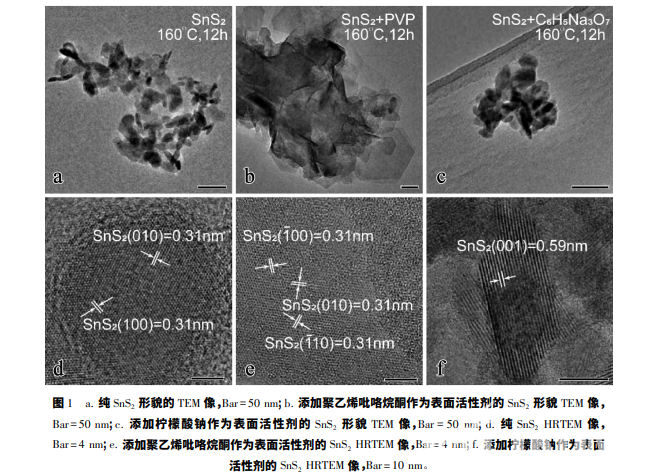 水熱法制備的純 SnS2 以及分別添加了聚乙烯吡 咯烷酮、檸檬酸鈉作為表面活性劑的 SnS2 透射電子 顯微像( transmission electron microscope,TEM) 、高分 辨透 射 電 子 顯 微 像 ( high resolution transmission electron microscope,HRTEM) 如圖 1 所示。圖 1a 為純 SnS2 納米片的 TEM 像,制備過(guò)程中未加入任何表面 活性劑。由圖可知,純 SnS2 納米片樣品團(tuán)聚嚴(yán)重,且 SnS2 納米片的結(jié)構(gòu)不完整。圖 1d 所示為純 SnS2 納 米片的 HRTEM 像,由該圖可知,樣品結(jié)晶性較好,可 觀察到清晰的二維晶格像。兩個(gè)方向上的晶格間距 都為 0. 31 nm,夾角為 60°,分別對(duì)應(yīng) SnS2 的( 100) 和 ( 010) 晶面。圖 1b,1c 分別為加入聚乙烯吡咯烷酮和 檸檬酸鈉作為活性劑的 SnS2 TEM 形貌像,圖 1( e,f) 分別是對(duì)應(yīng)的 HRTEM 像。圖 1b 顯示樣品邊緣處有 一些片層結(jié)構(gòu),這表明聚乙烯吡咯烷酮作為表面活性 劑對(duì)緩解 SnS2 團(tuán)聚有一定作用,但并不能有效解決 樣品團(tuán)聚的問(wèn)題。圖 1c 表明,當(dāng)使用檸檬酸鈉作為 表面活性劑時(shí),樣品為長(zhǎng)條形納米棒且分散性并沒(méi)有 得到改善。盡管圖 1 中的 HRTEM 像表明所制備的 樣品為 SnS2,但以上三種方法所制備出來(lái)的 SnS2 團(tuán) 聚嚴(yán)重,不利于該材料的后續(xù)應(yīng)用。從以上結(jié)果可看出,聚乙二醇作為表面活性 劑,SnS2 納米片的分散性最佳,且具有規(guī)整的六邊 形結(jié)構(gòu)。