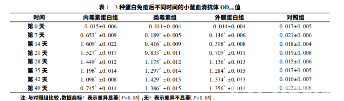 采用間接 ELISA 法檢測 3 種蛋白免疫組和對照 組小鼠血清抗體水平,結(jié)果 3 種蛋白免疫后小鼠血清 抗體效價(jià)均隨免疫進(jìn)程持續(xù)升高,免疫組與對照組差 異顯著( P<0. 05) ,見表 1。
