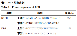 ET-1 mRNA 含量 取新 鮮冰凍組織約 100 mg,加 trizol 試劑,并研磨裂解。 加入三 氯 甲 烷 200 μL,混 勻 后 靜 置 5 min。4 ℃ 12 000 r·min - 1,離心 15 min,轉 移 上 層 至 1. 5 mL EP 管中,加入異丙醇 400 μL,混勻后靜置 10 min。 離心,棄 上 清,加 入 75% 乙 醇 1 mL,混 勻 后 離 心 5 min。棄上清后,于空氣中干燥 RNA 沉淀,將其溶 于 20 μL DEPC 水中,取溶解后的 RNA 2 μL 用微量 分光光度計測定 RNA 的純度和濃度。根據 A 計算 樣品 RNA 的 濃 度。逆 轉 錄 成 cDNA,反 應 條 件: 25 ℃ 5 min,50 ℃ 15 min,85 ℃ 5 min,4 ℃ 10 min。 Real-time PCR 檢測,cDNA 做 10 倍稀釋,反應條件: 50 ℃ 2 min,95 ℃ 10 min; 95 ℃ 30 s,60 ℃ 30 s, 40 個循環。繪制熔解曲線,最終以 2 - ΔΔCt 表示。