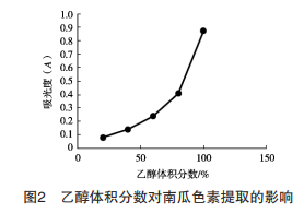 用6種不同的料液比對(duì)南瓜色素進(jìn)行提取,試驗(yàn) 結(jié)果如圖1所示。可看出南瓜色素的吸光度在0.1~0.3 之間,曲線呈下滑趨勢(shì),料液比越低,南瓜色素的提 取效果越好。料液比較低,曲線下滑很快,在1︰ 8~1︰12(g/mL)間處于較平穩(wěn)狀態(tài);料液比較高, 南瓜色素的吸光度繼續(xù)快速下降,考慮到試驗(yàn)的方便 性,可選擇1︰10(g/mL)的料液比作為南瓜色素提 取的條件。 用5種不同的乙醇體積分?jǐn)?shù)對(duì)南瓜色素進(jìn)行提 取,試驗(yàn)結(jié)果如圖2所示。可看出乙醇體積分?jǐn)?shù)對(duì)南 瓜色素的提取曲線呈上升趨勢(shì),且越來越陡,當(dāng)乙醇 體積分?jǐn)?shù)為100%時(shí)吸光度達(dá)到最大值,因此當(dāng)乙醇 體積分?jǐn)?shù)為20%,40%,60%和80%時(shí)南瓜色素的提 取效果均不好,無水乙醇效果最好。