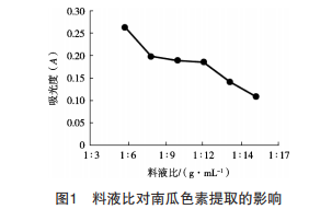 稱取6份南瓜,每份5 g。其他條件相同時(shí),用體 積分?jǐn)?shù)95%乙醇,以不同料液比(1︰6,1︰8,1︰10,1︰12,1︰14和1︰16 g/mL)加入碎狀南瓜中, 將其放入50 ℃恒溫箱中浸提2 h。將得到的浸提液離 心后,稀釋到相同倍數(shù),在446 nm波長(zhǎng)下用7200可見 分光光度計(jì)分別測(cè)其吸光度。