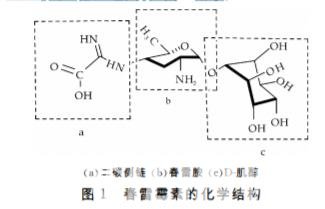 春雷霉素(Kasugamycin)又名春日霉素?加收米?加瑞農(nóng)等,是由春日鏈霉菌(Streptomyceska-sugaensis)所產(chǎn)生的一種氨基糖苷類抗生素.春雷霉素作為農(nóng)用殺菌劑,被廣泛應(yīng)用于農(nóng)業(yè)生產(chǎn),不僅具有較好的防治植物疾病的效果,并且對人畜無毒害作用,無污染和無殘留符合現(xiàn)代環(huán)保要求,是目前最具推廣前景的綠色農(nóng)藥之一,也是當(dāng)前農(nóng)作物病蟲害防治中具有廣闊發(fā)展前景的農(nóng)藥之一.春雷霉素的結(jié)構(gòu)由春雷胺(Kasugamine)?D-肌醇(D-inositol)和二碳側(cè)鏈(Two-carbonsidechain)共三部分組成,如圖1所示。