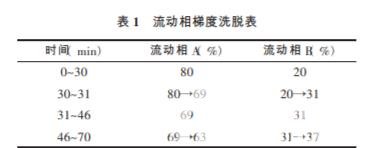 對照品的 制備: 稱取三七總皂苷對照品 63.01 mg, 配置時加 70%甲醇,溶解定容到 25 mL。 配置濃度:2.5 204 mg/ mL。 標(biāo) 示 含 量 :R1:7.4%、Rg1:26.3%、Re:3.7%、Rb1: 27.7%、Rd:7.6%。 供試品溶液的制備:稱取 30%乙醇洗脫部位凍干 粉末 50.7 mg,30%甲醇定容置至 25 mL, 超聲溶解, 有機系濾頭過濾,取續(xù)濾液進樣 10 μL;稱取 70%乙 醇洗脫部位 50.3 mg, 甲醇定容置至 25 mL, 超聲溶 解,濾頭過濾,取續(xù)濾液進樣 10 μL。 HPLC 色譜條件:色譜柱:Ecosil-C18 柱( 250 mm× 4.6 mm,5 μm) ;流 速:1.0 mL/min;柱 溫:30 ℃;進 樣 量:10 μL;檢測波長:203 nm;流動相:乙腈-水溶液, 按表 1 進行梯度洗脫[7]。