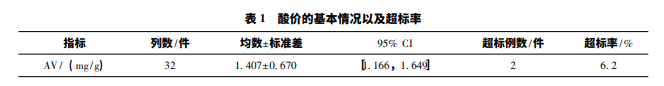 根據(jù)表 1 的結(jié)果,在 32 件實(shí)驗(yàn)樣品中,樣品合 格數(shù)為 30 件,樣品合格率為 93. 8%,不合格樣品的 酸價分別為: 3. 1mg / g 和 3. 2mg / g。