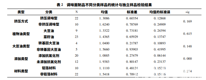 通過對樣品分類統(tǒng)計(jì)和分別進(jìn)行獨(dú)立樣品 t 檢驗(yàn) 得到如下表 2,包括按產(chǎn)品制作方式、原料用油種類、 原料用油的轉(zhuǎn)基因與否、添加抗氧化劑與否及包裝質(zhì) 地為鋁箔材料與否 5 方面進(jìn)行分類分析,并統(tǒng)計(jì)了各組分類的觀測量個數(shù)、平均數(shù)、標(biāo)準(zhǔn)差和平均數(shù)的標(biāo) 準(zhǔn)誤差。其中僅有添加抗氧化劑類型的分析檢驗(yàn) sig< 0. 05,所以表明調(diào)味面制品的酸價值的大小與抗氧化 劑的添加與否有顯著差異,其余均無顯著差異。