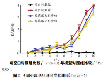 造模前、造模后和給藥后分別 觀察小鼠精神及活動狀況,每天記錄小鼠體質量變 化、大便性狀及便血情況,計算疾病活動指數( disease activity index,DAI) 。體質量變化 ( %) = ( 造模后體 質量-造模前體質量) /造模前體質量×100%。評分如 下,①0 分: 體質量無變化,大便正常,無便血; ②1 分: 體質量變化 1% ~5%,便軟,成型,有便血點; ③2 分: 體 質量變化 5% ~10%,大便有黏液,成型,成塊便血; ④3 分: 體質量變化 10% ~ 15%,便軟,有黏液,成型,成片 的便血; ⑤4 分: 體質量變化 15% ~20%,便軟,有黏液, 不成型,便血及肛門腫脹。